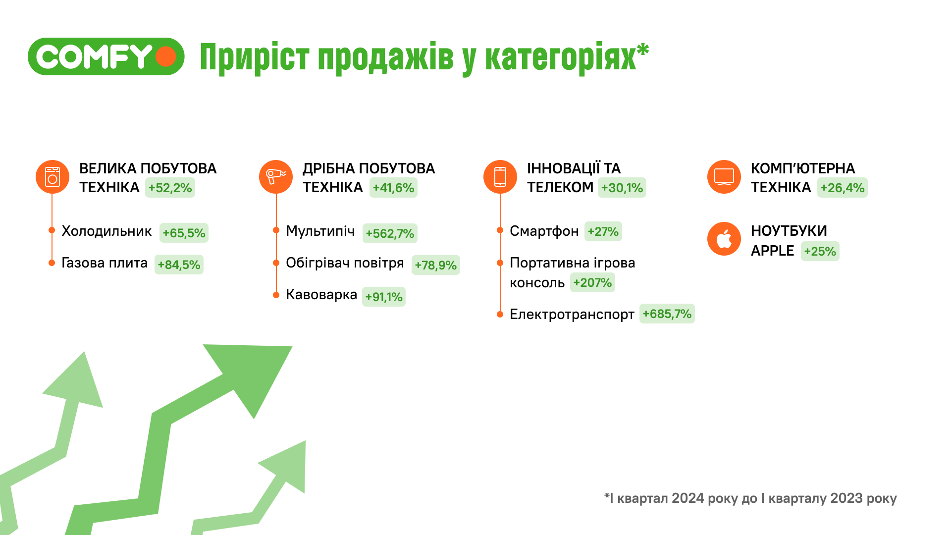 Еще одним фактором успеха COMFY стала эффективная коммерческая и маркетинговая стратегия, способствовавшая качественному удовлетворению потребностей покупателей и увеличению продаж во всех товарных категориях. Так, продажи мелкой бытовой техники увеличились на 42% по сравнению с прошлым годом, а драйверами этой категории стали: мультипечь (563%), кофеварка (91%), обогреватель (79%). Продажа большой бытовой техники увеличилась на 52%, а лучшую динамику в категории продемонстрировали газовая плита (85%) и холодильник (66%).