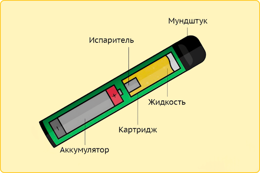 Одноразовые электронки имеют стандартную конструкцию под-систем, включающую в себя несколько основных элементов: