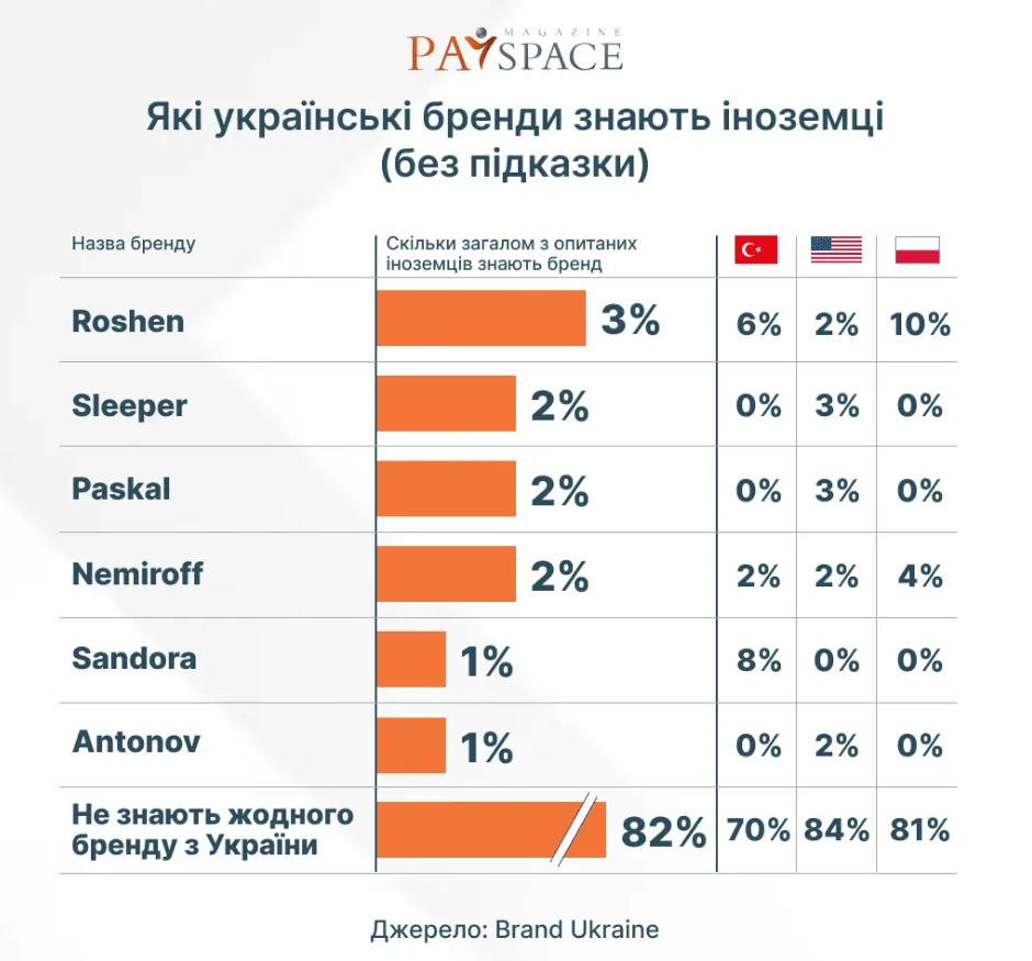 По результатам исследования, каждый седьмой иностранец назвал компанию Roshen. Чаще бренд вспоминали жители соседней Польши — 10%. В Турции чаще всего упоминали соки Sandora (8%), во Франции — бренд головных уборов Ruslan Baginskiy (3%), в Великобритании — бренд одежды Frolov (4%).