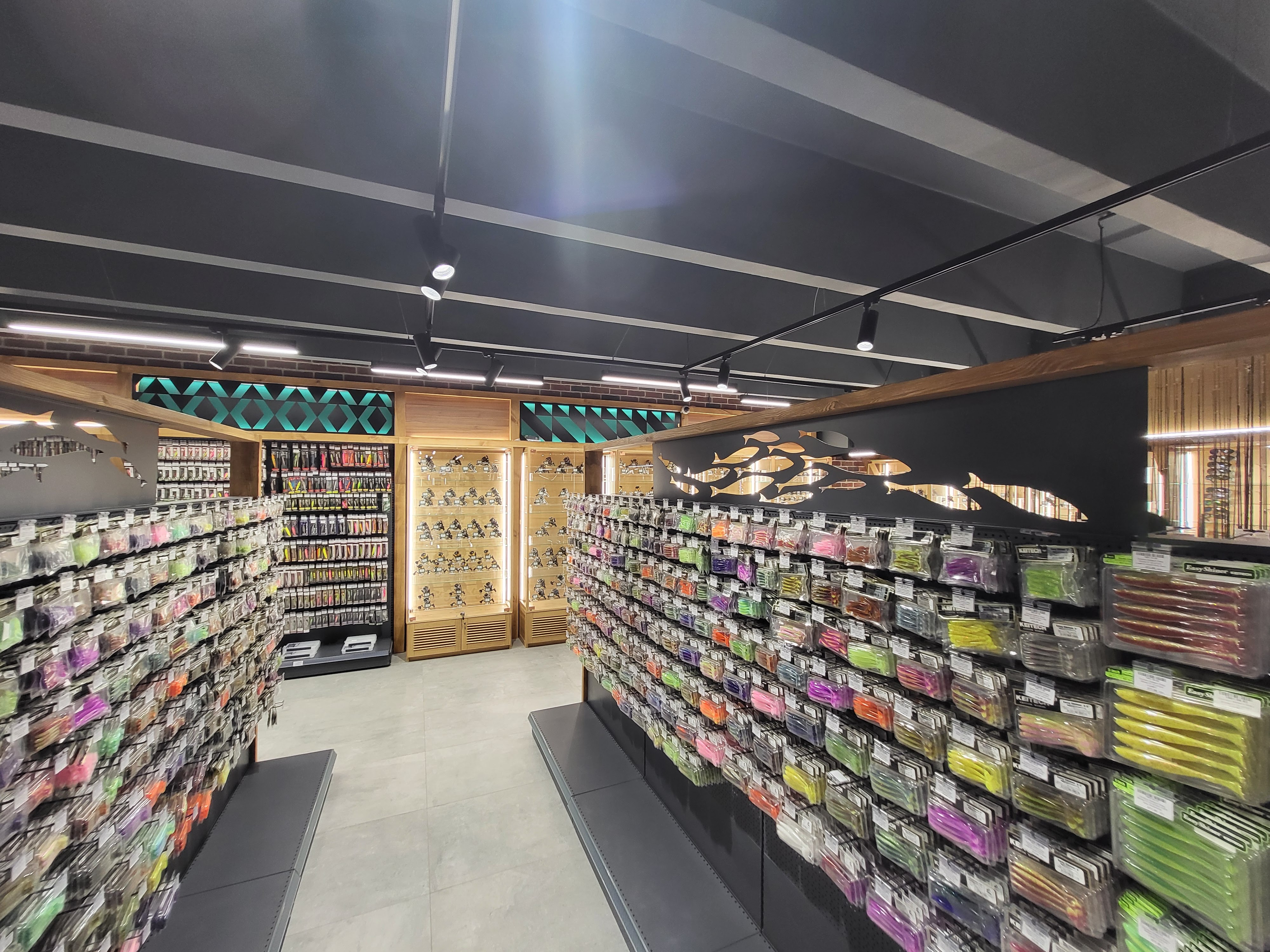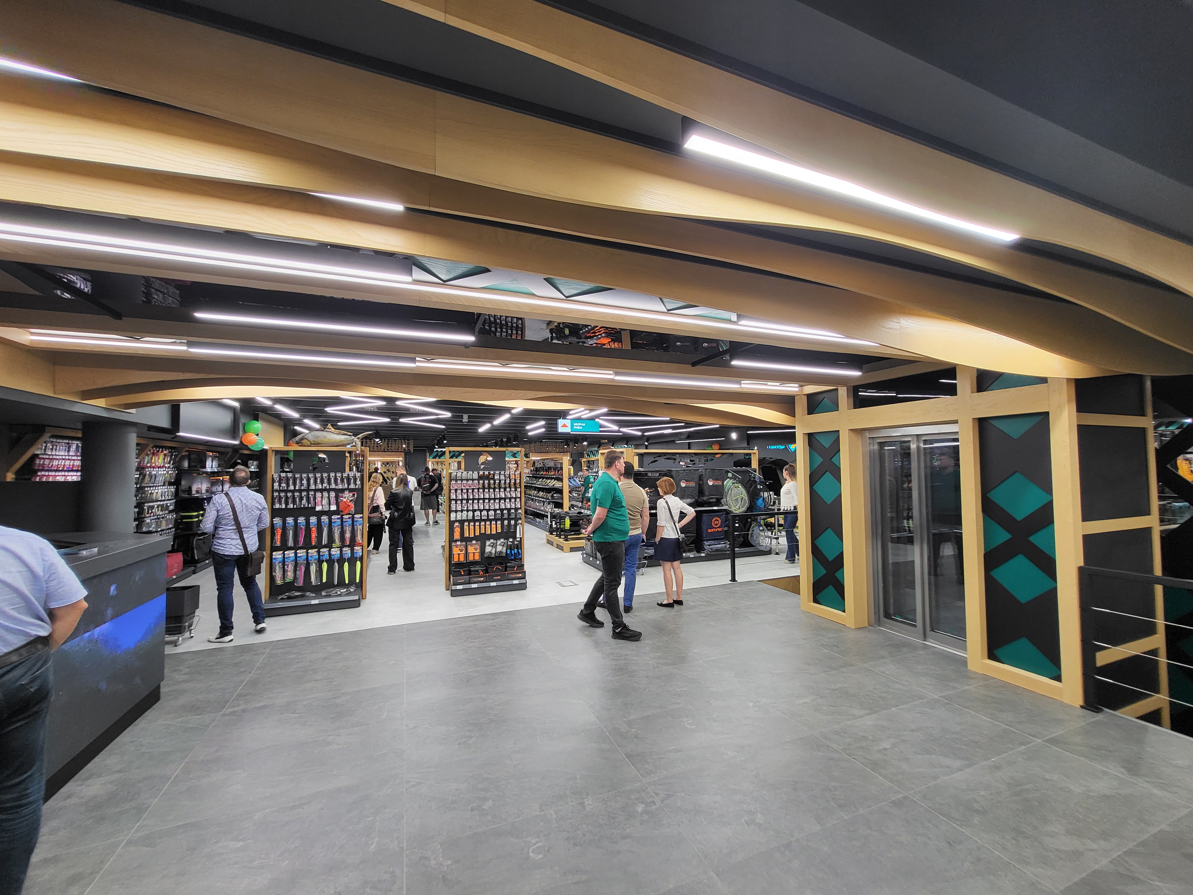 В целом в этом проекте, по словам дизайнеров, многое построено на тематических декоративных образах. Каждый стеллаж создан под заказ и декорирован под соответствующую зону. В отделе рыболовства дизайнеры добавили деревянные волны, идущие по потолку от лестницы, плавно подхватывая движение и воспроизводя водную тематику. Черно-зеленый орнамент, который в разных вариациях воспроизводится во всех зонах магазина, привлекает внимание посетителей.