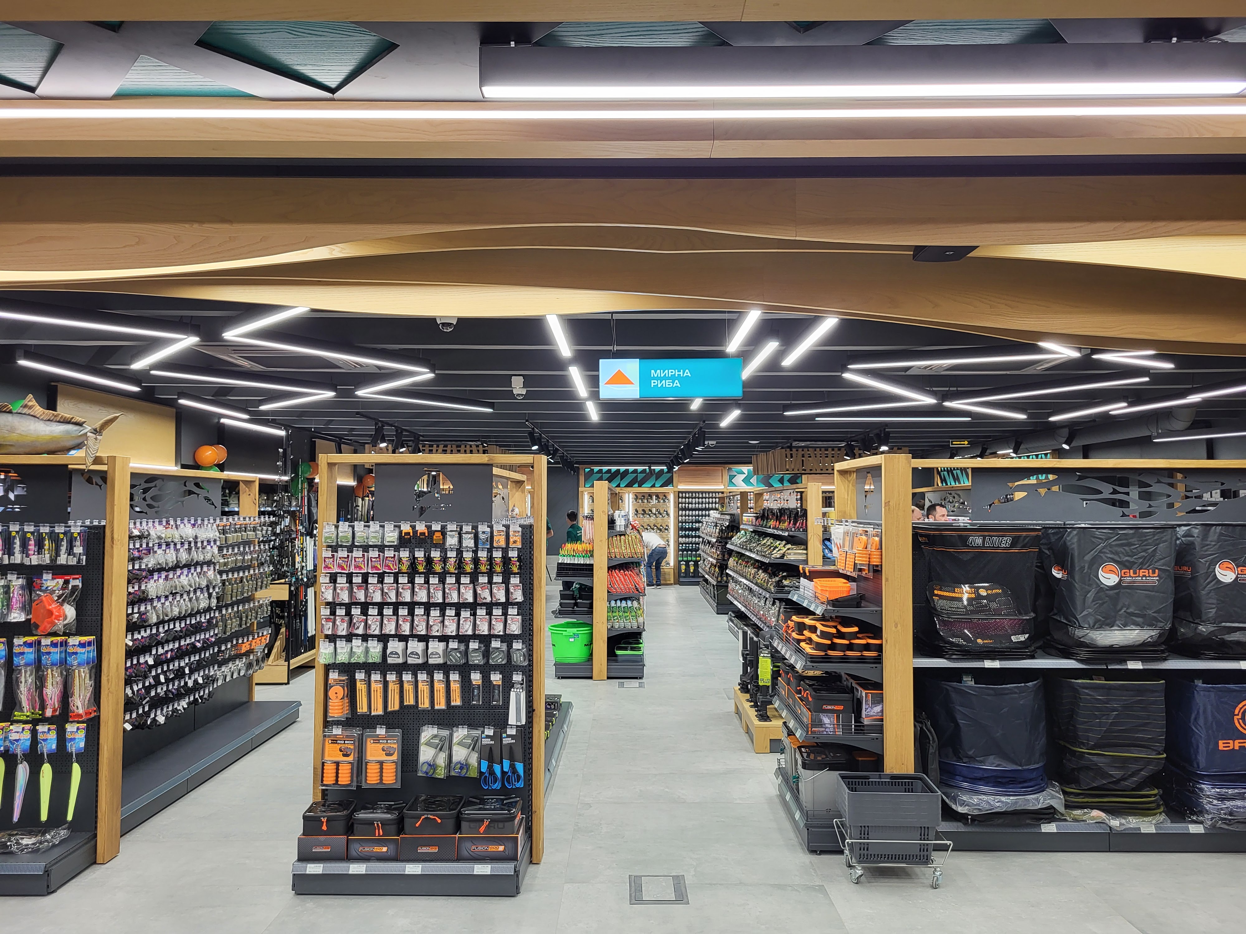 Над интерьером магазина работала киевская студия дизайна и архитектуры Znak Design. Магазин разделен на несколько зон: на первом этаже — отделы одежды, оружия и кафе, а на втором — рыболовные и туристические товары.