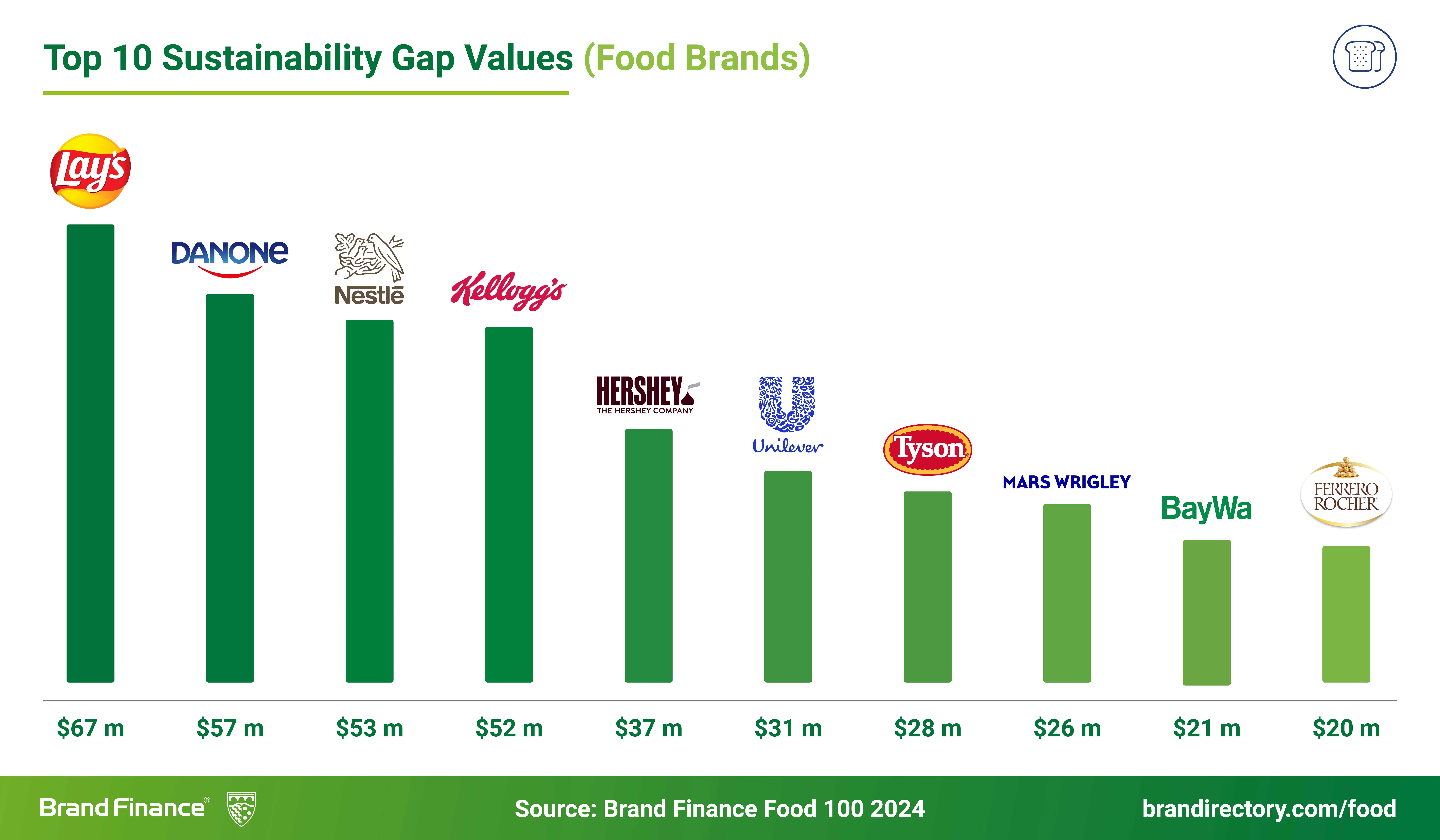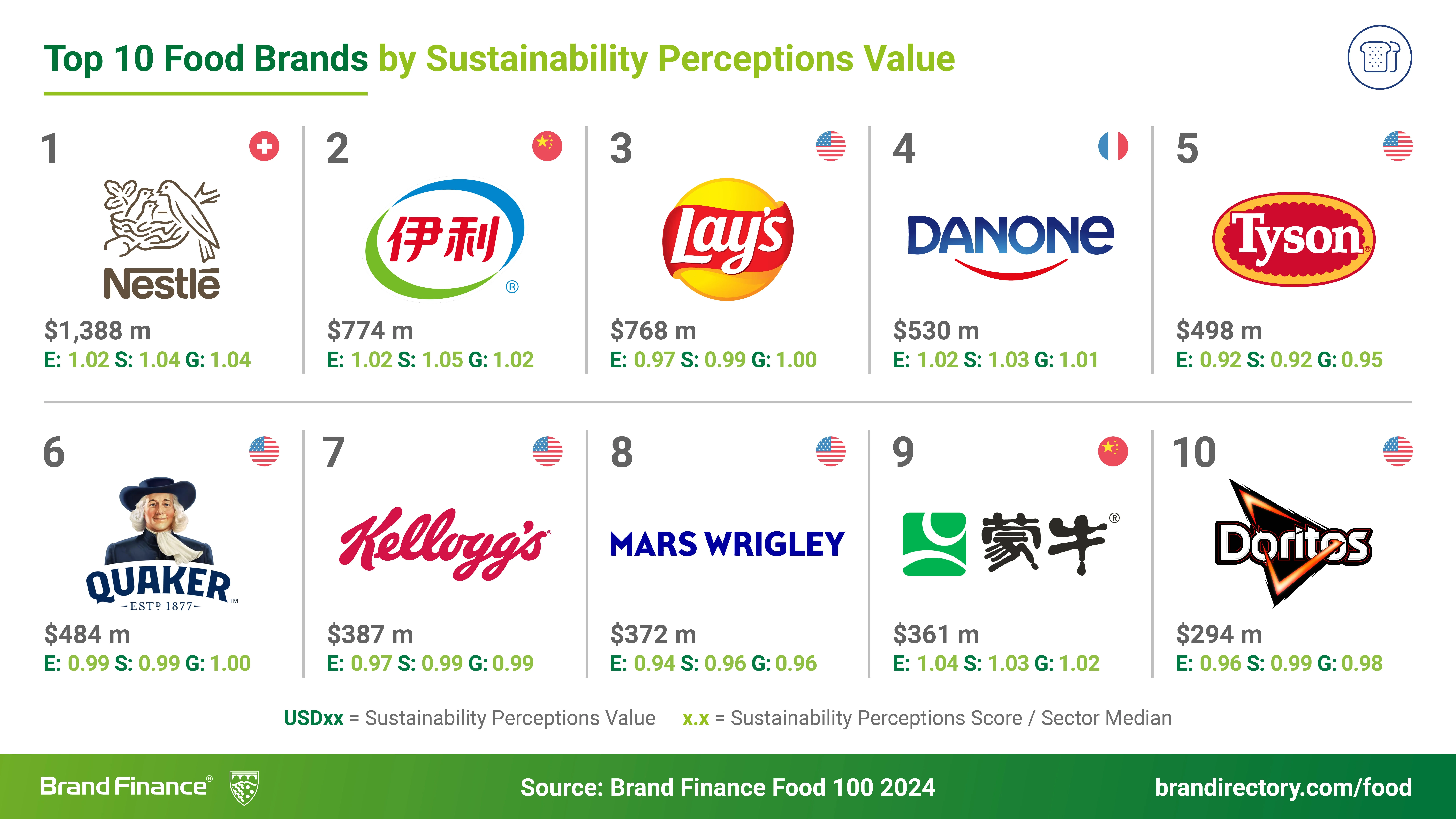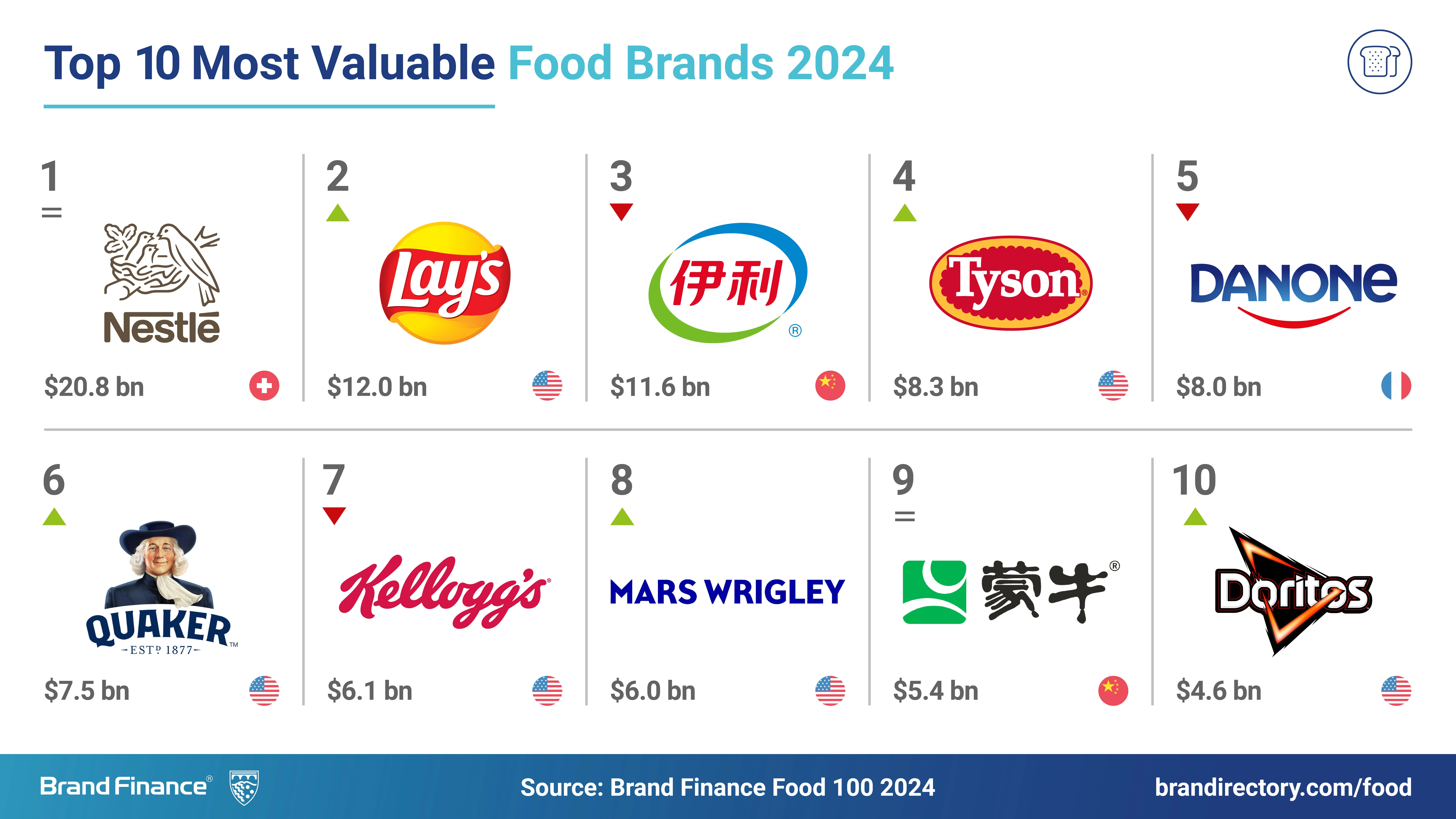 Бренд Wrigley поднялся на восьмую позицию с десятой (+7,5%, до $6 млрд), китайский Mengniu остался на девятой строчке (-11,1%, до $5,4 млрд), а на десятое место с тринадцатого достался американский бренд Doritos (+12% до $4,6 млрд).