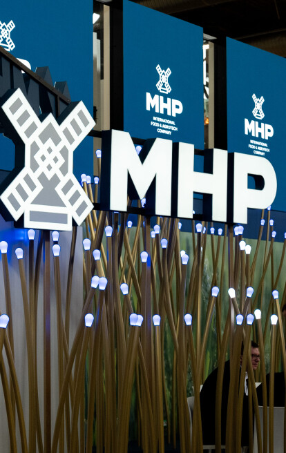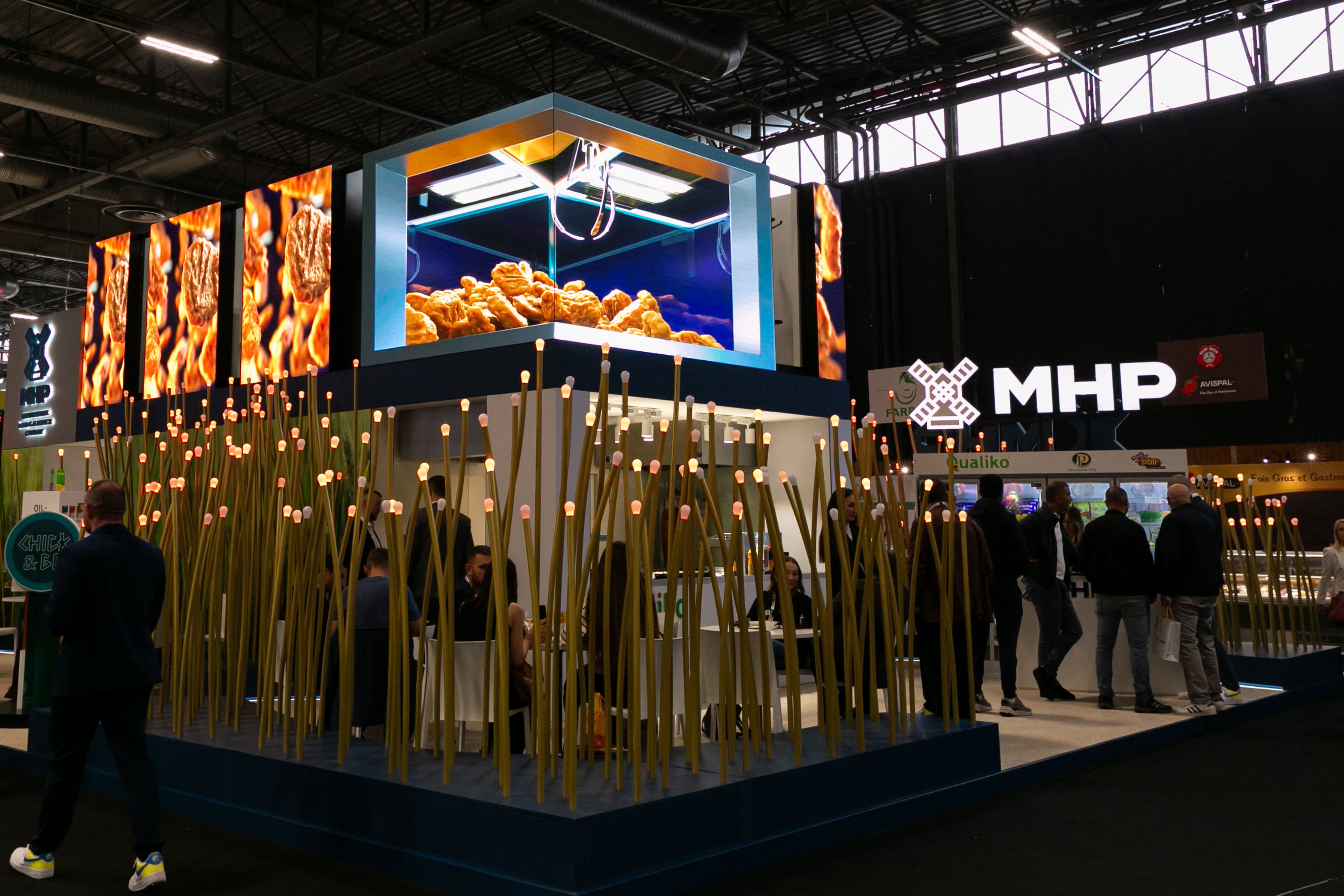 Стенд МХП был исполнен в виде 360-градусной двухэтажной платформы с большим цифровым 3D-экраном впереди. Под ним находилась открытая кухня, где бренд-шефы МХП демонстрировали процесс приготовления ready-to-cook блюд.
