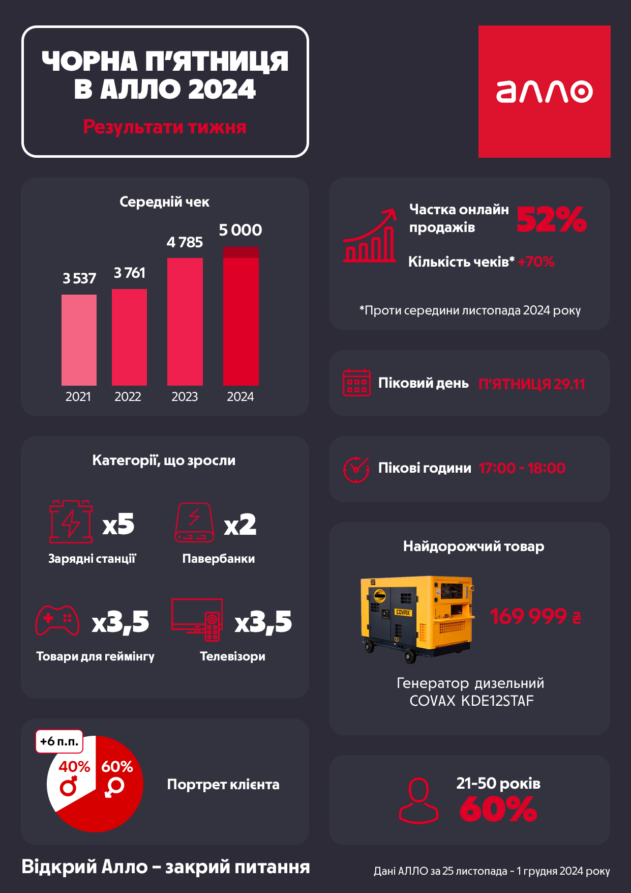 Черная пятница у «Алло» завершилась с высокими показателями: объем продаж превысил показатели Черной пятницы 2023 года на 10%, средний чек вырос на 35%, а количество чеков увеличилось на 70% против середины ноября. Доля онлайн-продаж в «Алло» выросла до рекордных 52% (+6 п.п.). Уменьшилась доля покупок среди мужчин и возросла доля покупок среди женской аудитории (+6 п.п.). В этом году увеличился спрос на энерготовары, тогда как в прошлом году клиенты больше покупали бытовую технику.