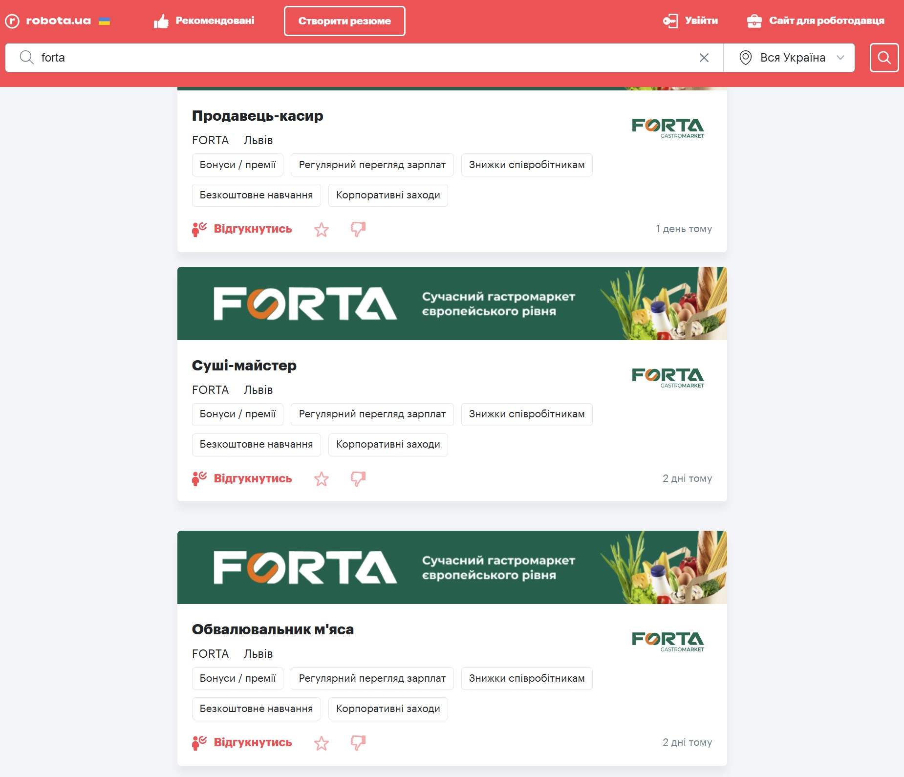 Это пятая торговая точка сети на Западе Украины. FORTA позиционируется как современный супермаркет с кулинарией собственного производства, блюдами на мангале, пиццей и пекарней. Сеть принадлежит группе компаний TOLIMAN group, которая также управляет сетью Чудо Маркет.
