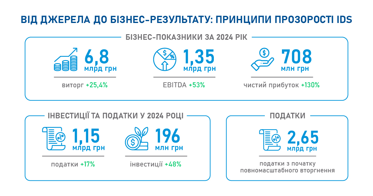 "Рост экономических показателей в течение 2024 года позволил IDS Ukraine достичь рекордных объемов уплаты налогов в бюджеты всех уровней в сумме 1,15 млрд грн, а с начала полномасштабного российского вторжения налоговый взнос IDS Ukraine в бюджеты всех уровней достигает 2,6 млрд грн", — прокомментировали в компании.
