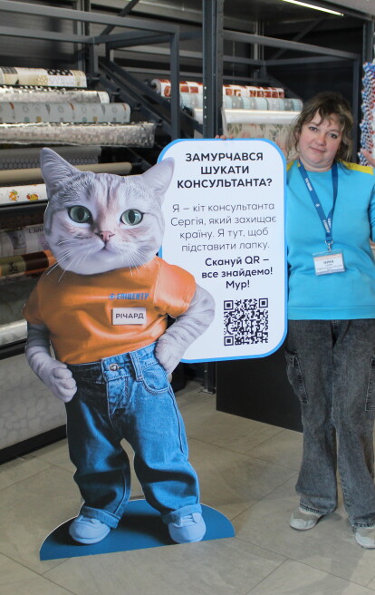 В торговом зале установлены ростовые фигуры пушистых консультантов — домашних животных мобилизованных работников: кошек Ричарда и Монти, собак Сера и Бусинки, а также шиншиллы Сони. На каждой фигуре — персональный QR-код. Сканируя код, клиент получает набор опций для решения своего вопроса: