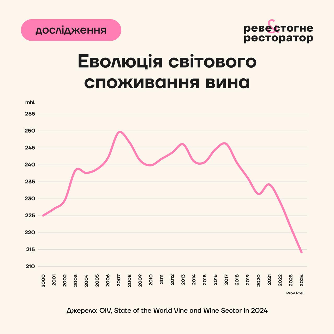 Международная организация виноградарства и вина (OIV) опубликовала ежегодный отчет по производству и потреблению вина в мире.