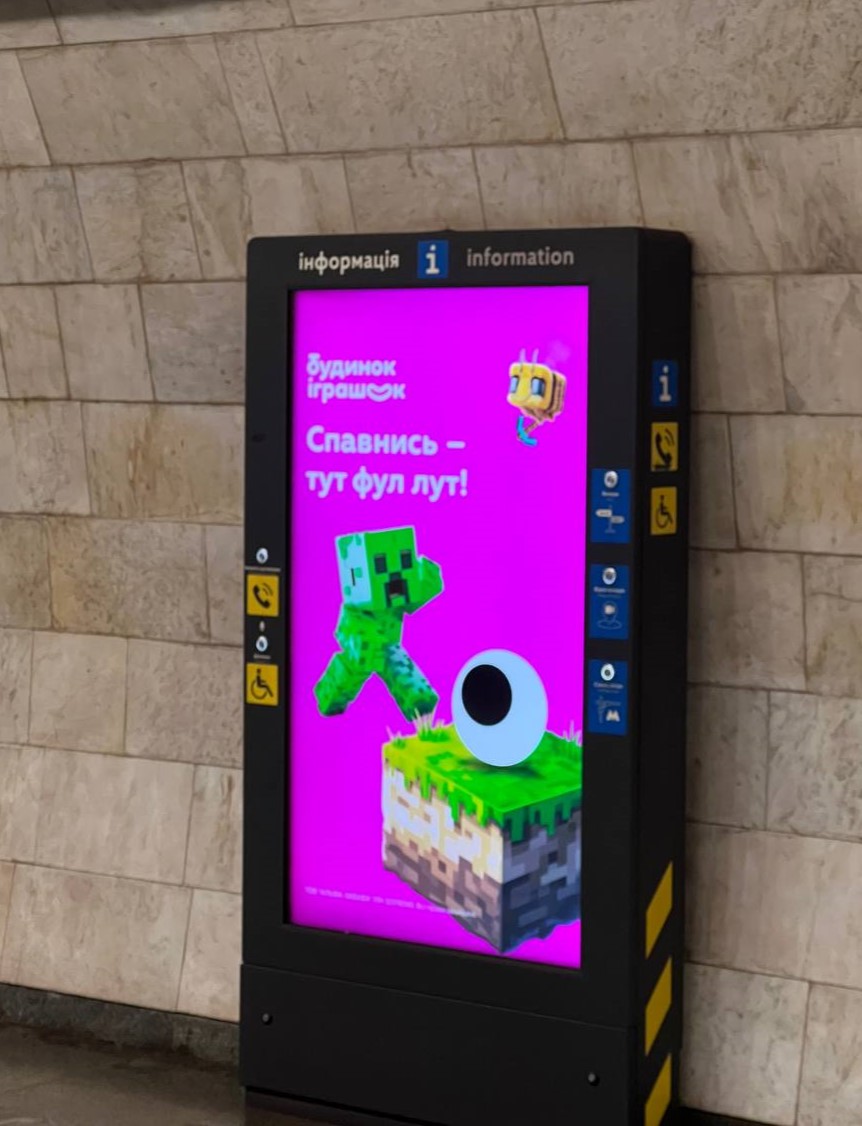 Кампания охватывала разные классические каналы: внешние цифровые борды, рекламу в кинотеатрах, медийное продвижение. Впрочем, креативы адаптировали под знакомый пользователям мир Minecraft. Ритейлер сознательно не упоминал Minecraft буквально, но взял его визуальный язык: стилистику, цвета, форму блоков. А традиционный глаз на аватарке Instagram-страницы «Будинок Іграшок» на этот период получил пиксельное обновление в стиле игры.