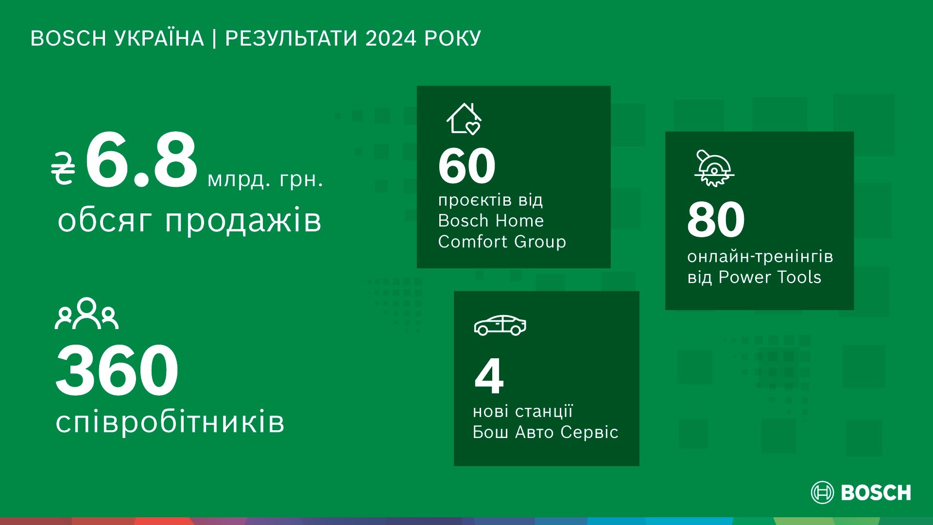В 2024 году Bosch в Украине достиг объема продаж в 156 млн евро, несмотря на войну, снижение спроса и перебои с электроснабжением. Компания сохранила команду из 360 сотрудников и продолжает инвестировать в критические направления: теплоэнергетику, инфраструктуру, сельское хозяйство, авто- и строительные технологии.