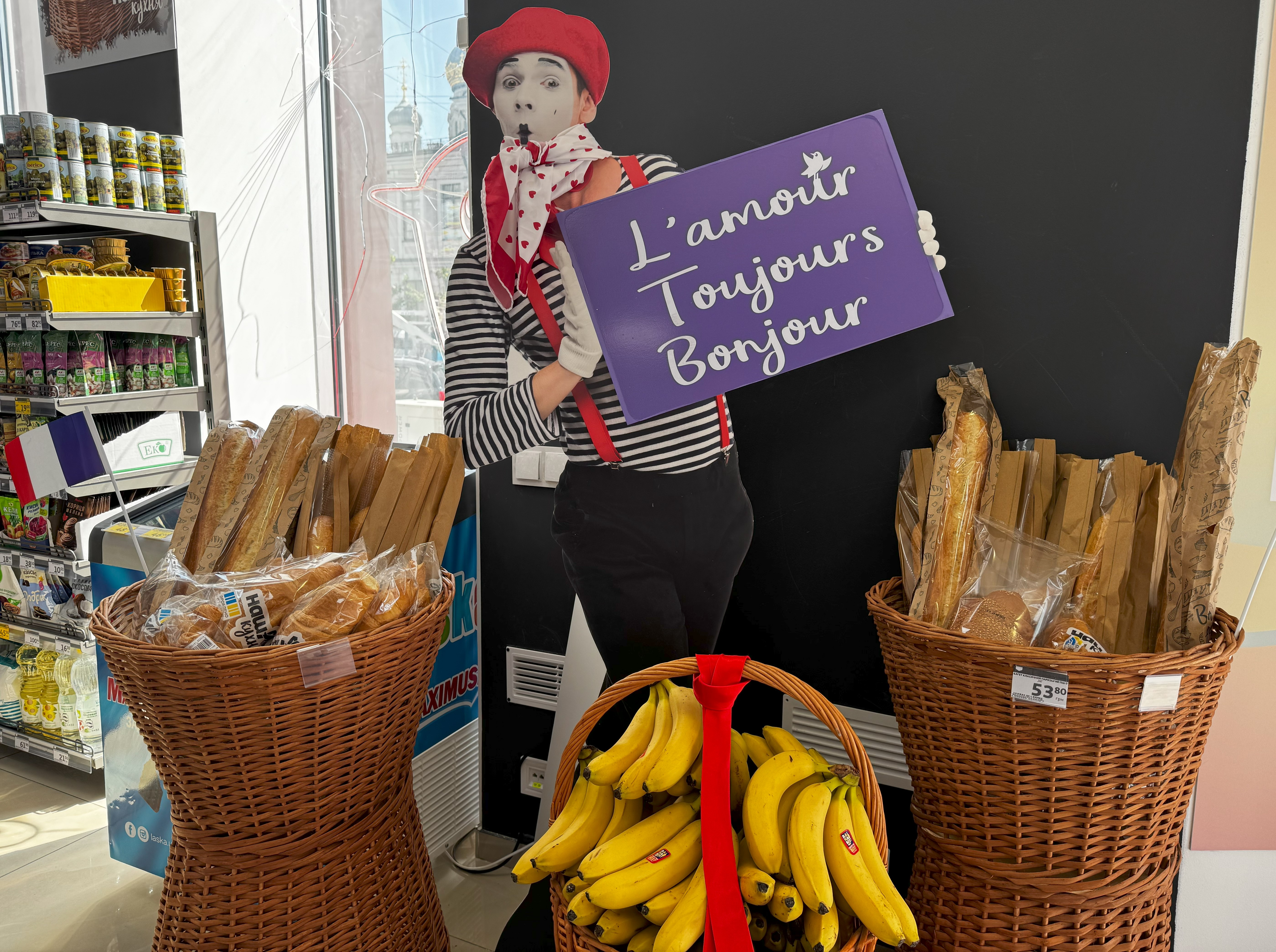 Оформление магазина с французскими нотками подчеркивает происхождение бренда Auchan. Особое внимание уделено гастрономическим традициям — в корзинах из лозы гостей ждут свежеиспеченные багеты, круасаны, эклеры и другое лакомство. В новом магазине можно заказать хот-дог или сделать кофе.