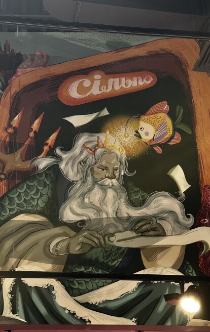 Потолок одного из отделов украшает будто плывущую бутылку. На стене — письмо моряка, которое ищет свою любимую, а зона кулинарии задекорирована имитацией морской сетки, поймавшей отрывки посланий путешественника с описаниями продукции из разных уголков мира.
