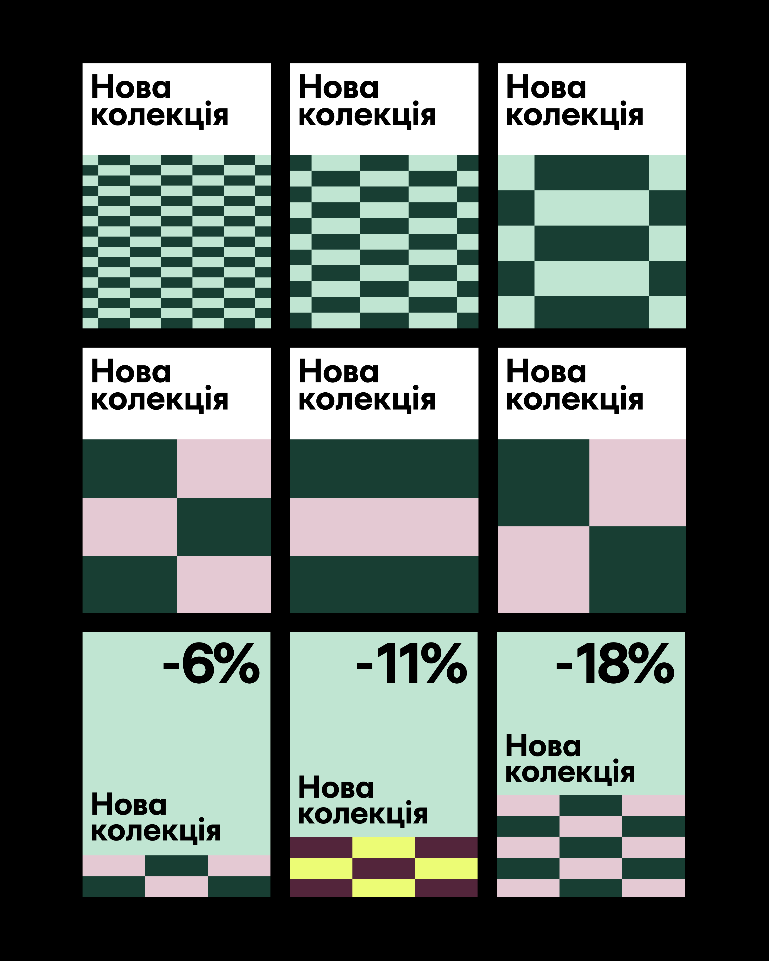 Начали с логотипа — сделали его более чистым и приветливым (обратите внимание на игривую ножку R), заменили основной шрифт на современный украинский гротеск, обновили основную цветовую пару, добавив в нее теплые оттенки, а потом вообще ввели неожиданные цветовые сочетания — от розового с бордо до электрик-желтого с серым. Ну и напоследок, оттолкнувшись от прямоугольника вывески добавили паттерн Баттенбурга или по простому «шахматку» и на ее основе разработали систему, позволяющую выкручивать заметность бренда на максимум, или наоборот стишиться до почти стелс-режима», — рассказал дизайн-директор и партнер Союза Владимир Смирнов.