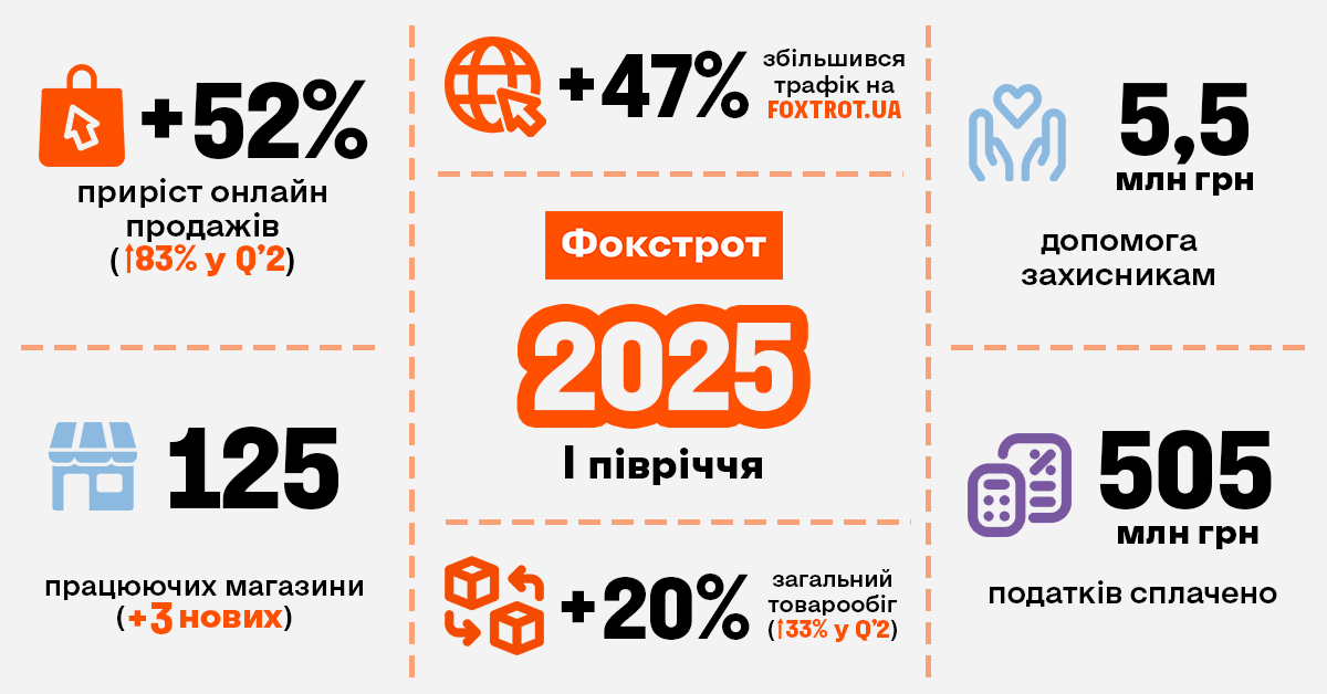 «Фокстрот» не только идет в ногу с онлайн-рынком — он опережает его по темпам роста, существенно укрепляя свои позиции в e-commerce. Онлайн-продажи на FOXTROT.UA за полгода выросли почти на 52%, а во втором квартале — на 83%. Количество онлайн-заказов увеличилось на 63%, а трафик сайта FOXTROT.UA — на 47%.