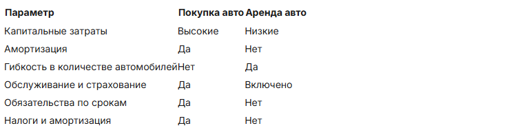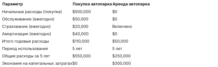 - Избежать жестких обязательств по долгосрочному содержанию автопарка, что делает компанию более мобильной и гибкой.