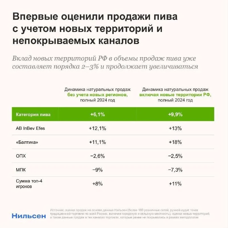 По данным исследования, оккупированные украинские земли составляют примерно 2–3% от объема продаж пива. Nielsen также отметила, что в 2024 году рост продаж пива «в пределах традиционных границ России» составил 6%. При учете «новых территорий» рост достиг 10%.