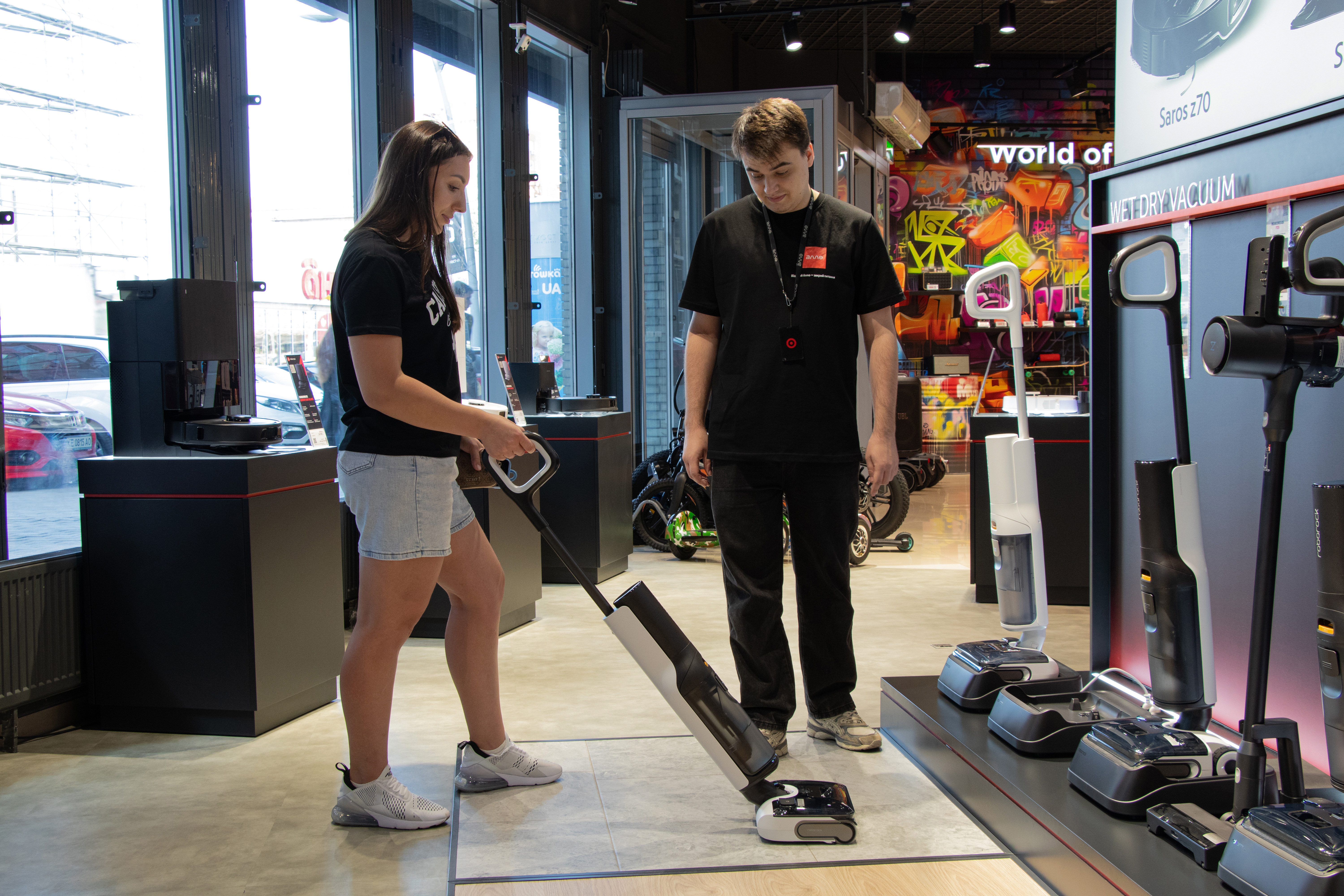 Фирменный магазин имеет собственную вывеску, а также вход внутри ТРК. В шоуруме представлены работы-пылесосы серий Saros и Qrevo, вертикальные пылесосы F25 и другие модели, а также аксессуары к ним.