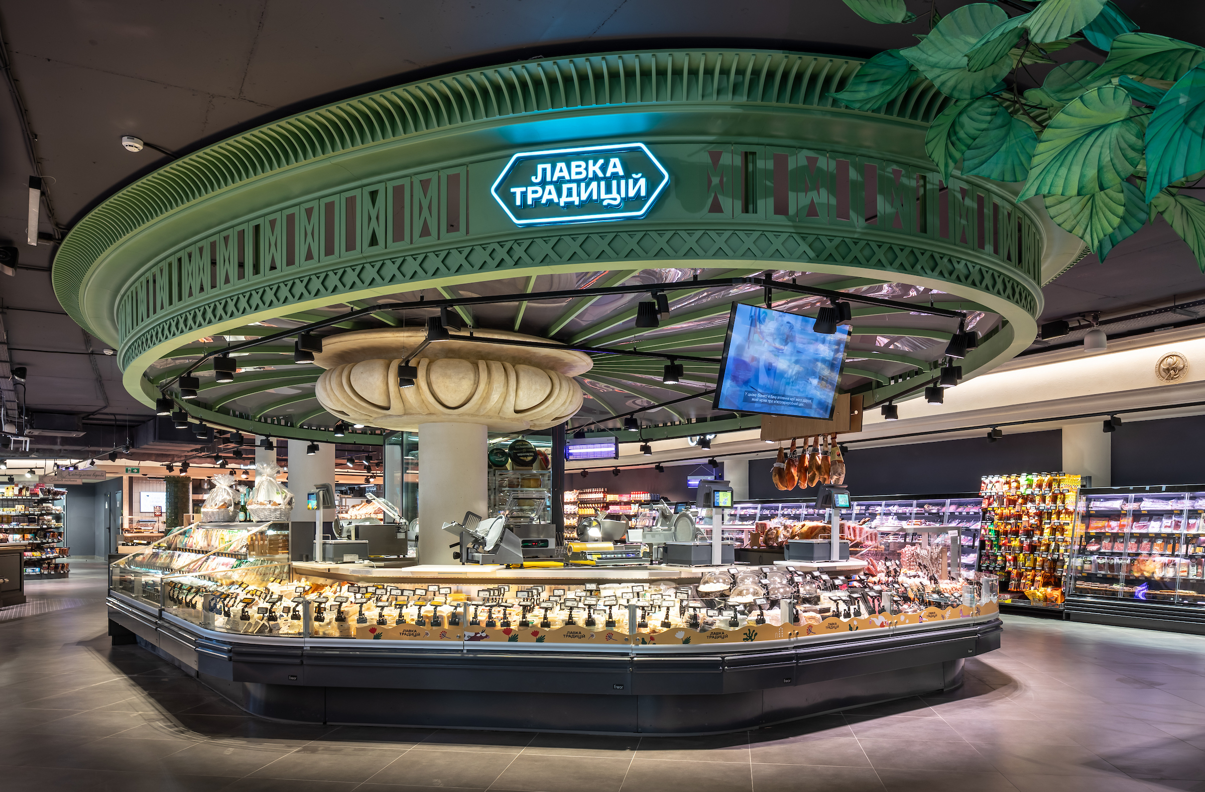 Остров «Кулинарии» воспроизводит атмосферу старого ипподрома на Печерских холмах, а кассовые лайтбоксы выполнены в виде витражей, как в доме Икскюль-Гильденбанда.