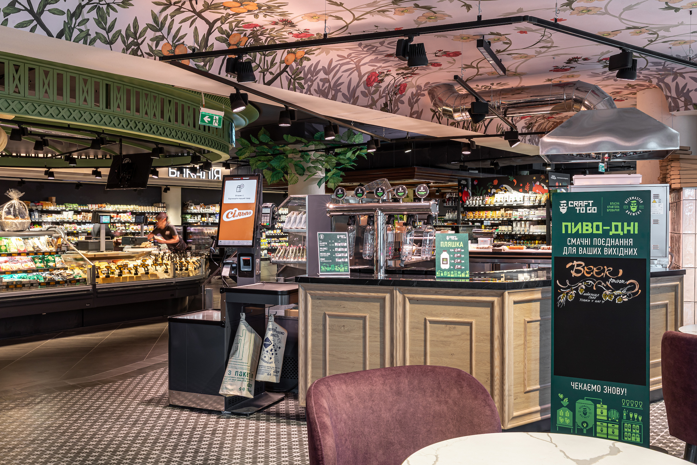 В торговом зале — мозаичные колонны от Lisova 3 art group с фрагментами киевских фасадов, присущих историческим местностям «Зверинец» и «Клов». Потолки и стены украшены авторскими иллюстрациями Екатерины Желтой.