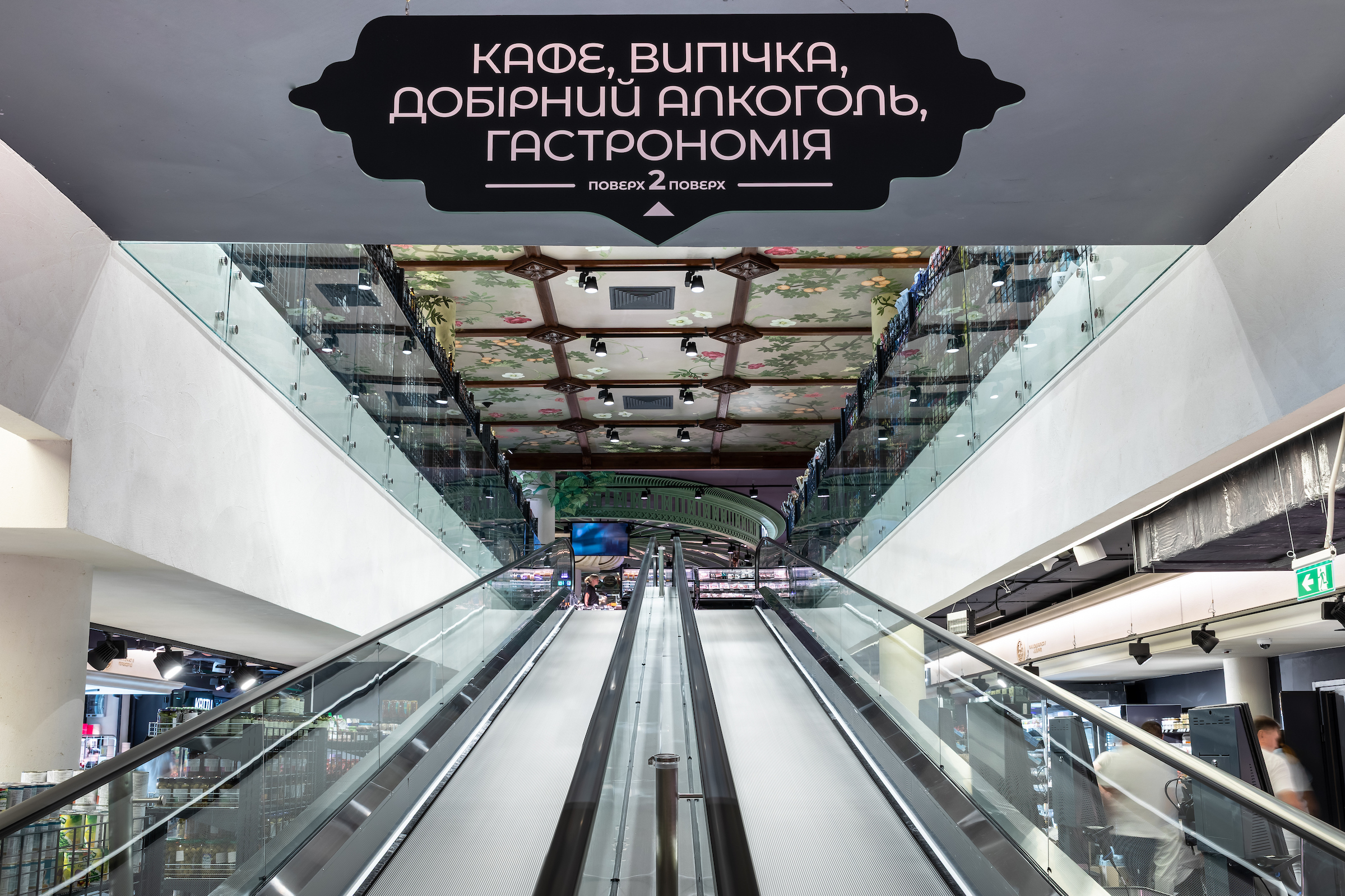 Гостей второго этажа встречает остров «Гастрономии» в форме старинной беседки, а над траволатором расположен кессоновый потолок, похожий на тот, что в «Шоколадном домике». В отделе выпечки колонна оформлена как старинный камин, а зона алкоголя напоминает о древних винодельнях Печерской Лавры.