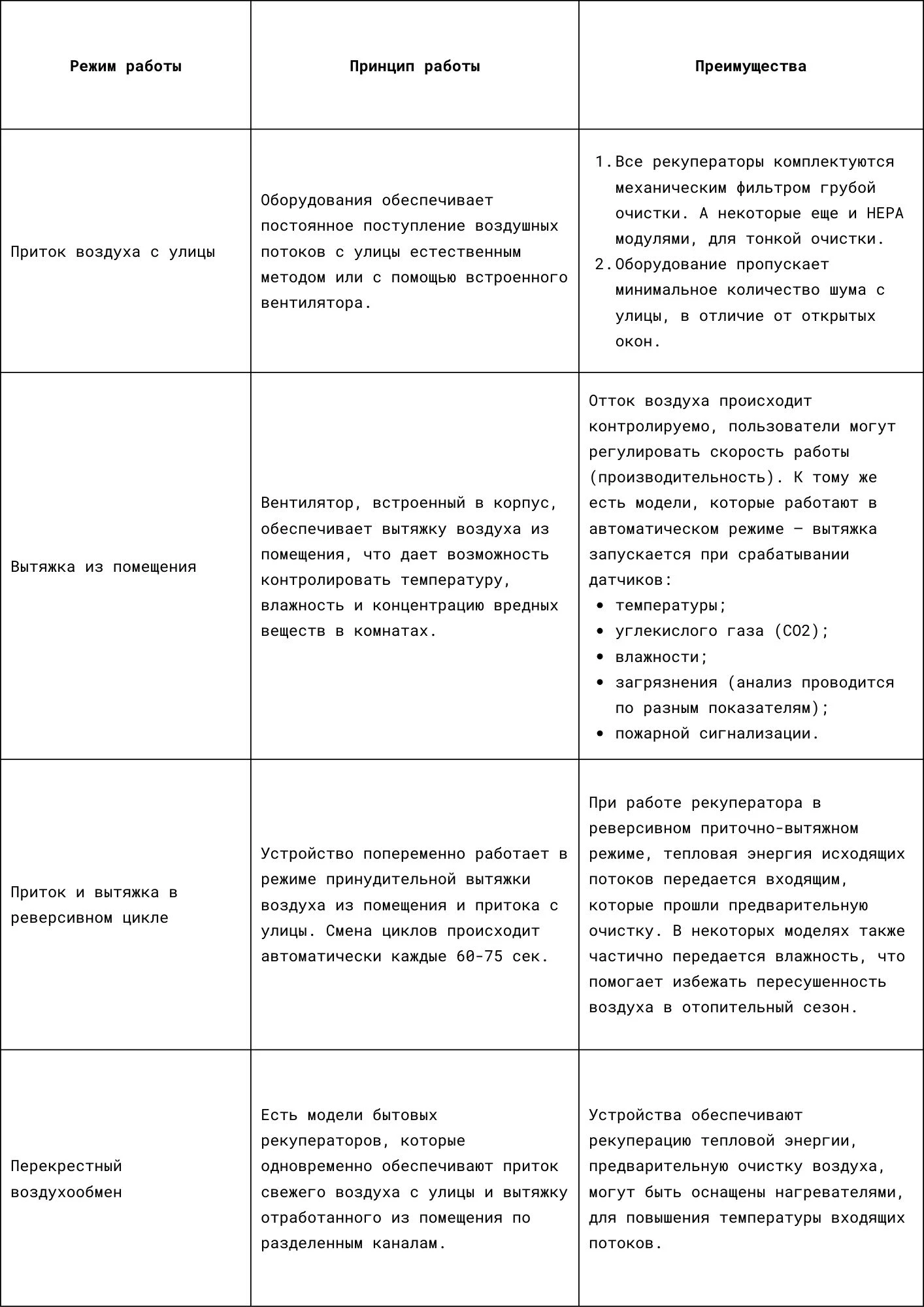 Эта таблица наглядно сравнивает основные режимы работы бытовых рекуператоров. В ней собраны четыре ключевых варианта подачи и отвода воздуха: приток с улицы, вытяжка из помещения, реверсивный цикл и перекрестный воздухообмен. Для каждого режима представлены принцип действия и основные преимущества — от эффективной фильтрации и снижения шума до сохранения тепла, автоматического контроля параметров и возможности подогрева входящих потоков. Благодаря структурированному виду таблица позволяет быстро оценить различия между технологиями и выбрать оптимальное решение для обеспечения качественной вентиляции в доме.