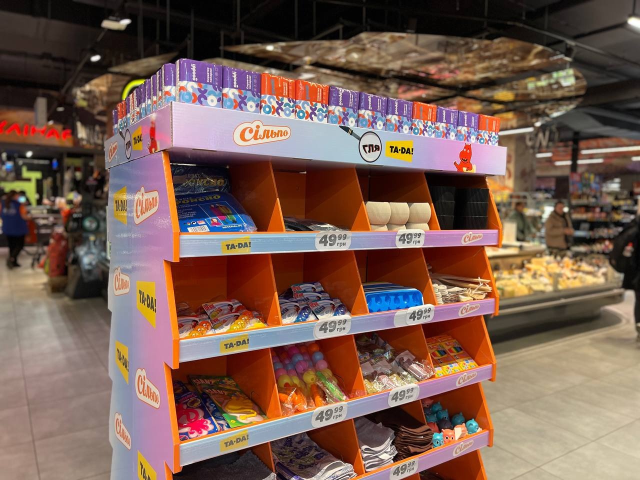 В рамках проекта в супермаркетах «Сільпо» выставлены специальные полки, где представлены десятки продуктов: от детских игрушек до бытовых мелочей, и все по одинаковой цене.