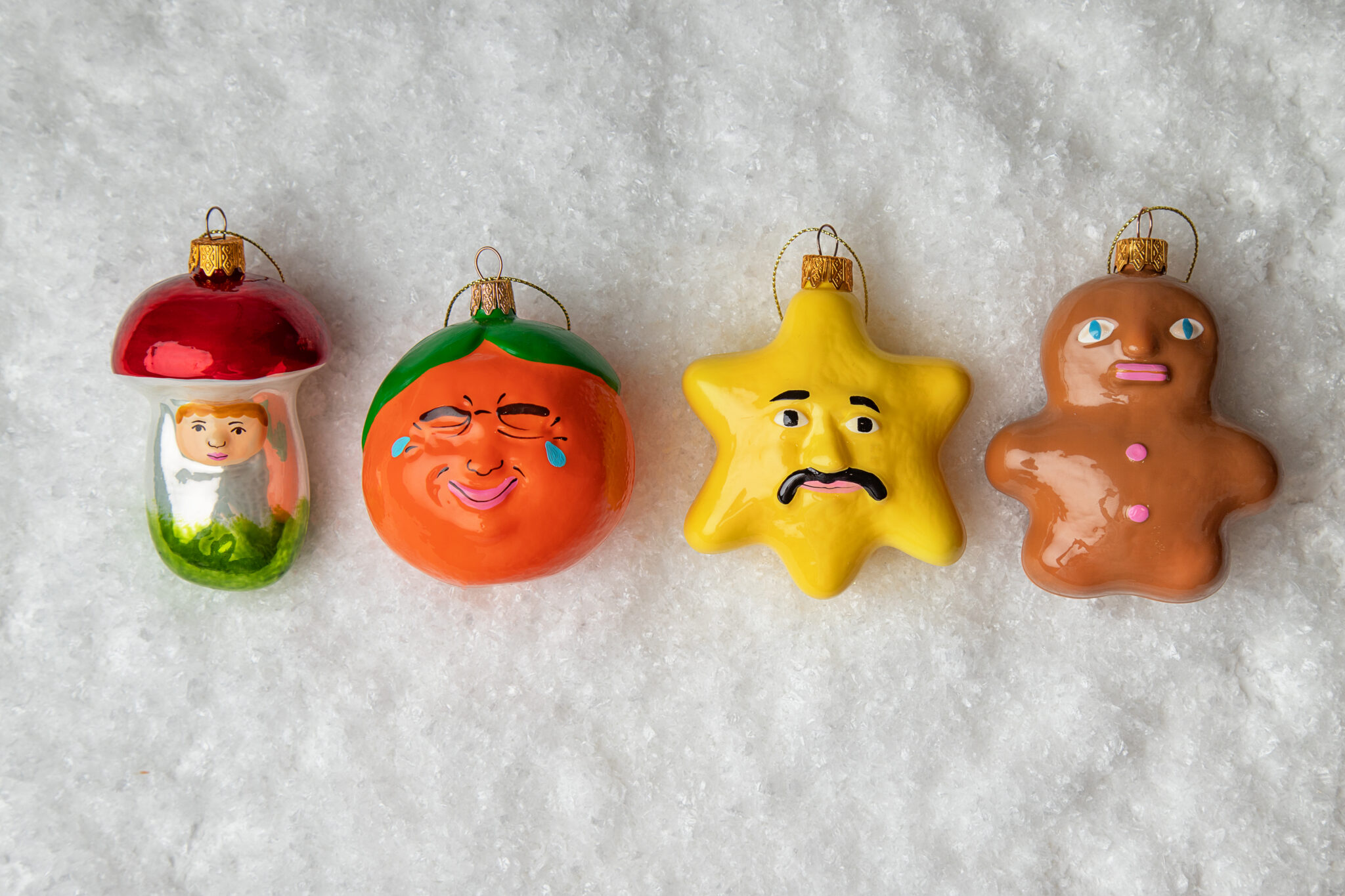 В коллекции — четыре игрушки: Попзвезда, Мандаринка, Грибочок и Неидеальный пряник. Они тоже немного неровные, смешные, но от этого еще теплее. Каждую выдували вручную, покрывали тонким слоем серебра, расписывали кисточками и упаковывали в фирменные коробки.