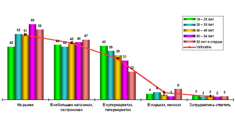 Основу посетителей рынков составляют украинцы возрастом 50-54 года (60% опрошенных этой возрастной группы). При этом многие из них посещают также небольшие гастрономы и крупные супермаркеты (45% и 31% опрошенных соответственно).