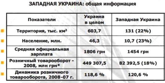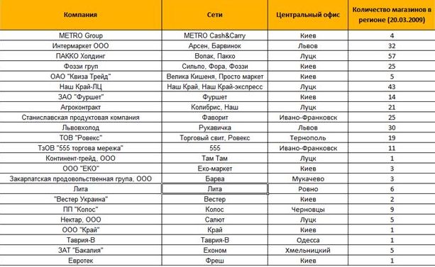 В Западной Украине насчитывается более 20 продовольственных розничных сетей, причем соотношение в этом списке местных сетей и сетей с «неместной пропиской» составляет примерно 50/50 (табл. 2).