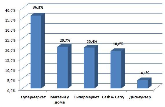 Почти 45 % своих покупок продуктов питания жители Западной Украины совершают в супермаркетах, и это не удивительно, поскольку основные здешние операторы («Вопак», «Сільпо») работают именно в этом формате (диагр. 1).