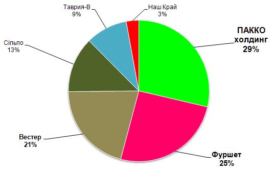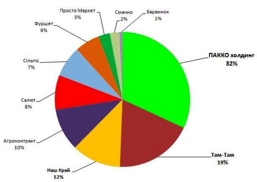 В городе Хмельницкий покупка холдингом «ПАККО» местных сетей «Дуглас» и «АВС», совершенная несколько лет назад, стала основанием того, что сейчас магазины этой компании занимают почти треть рынка в суммарном товарообороте. Большую долю (а именно 25%) занимает компания «Фуршет».