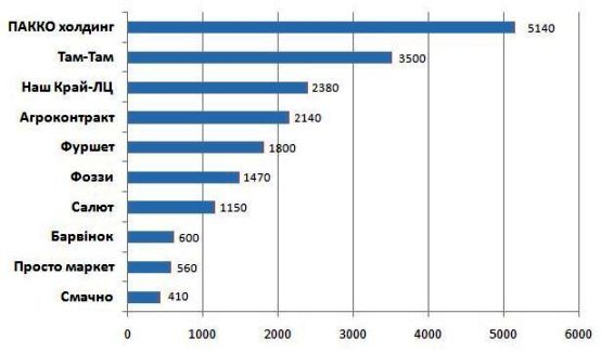 В г. Луцк монопольное положение на данном рынке занимают «компании местного разлива» - «ПАККО холдинг» и «Наш Край». Кроме того, самым популярным местом совершения покупок продуктов питания у населения Луцка является гипермаркет «Там Там», построенный 3,5 года назад. У оптовых покупателей спросом пользуются магазины ПАККО, работающие в формате cash & carry.