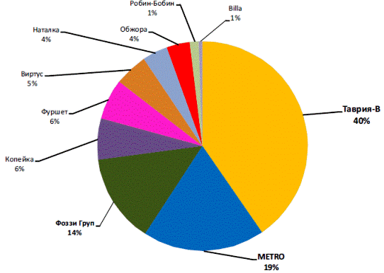Почти 65% рынка розничной торговли Южной Украины приходится на четыре компании – «Таврия-В», «Фоззи Групп», «Фуршет» и METRO.