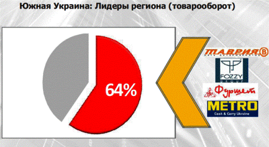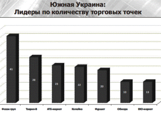 По показателю количества торговых точек в регионе на первом месте «Фоззи Групп» , развивающая все три свои формата здесь. Компания «Таврия-В» насчитывает в Южной Украине 28 магазинов.