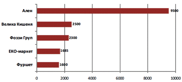 Ну, и наконец, в городе Севастополь в Крыму до последнего момента монопольное положение на рынке продовольственного ритейла занимала сеть «Ален» - соответственно 61% товарооборота и 9500 кв.м собственных торговых площадей. На много от нее отстали и «Фоззи Групп», и «Велика кишеня», и другие.