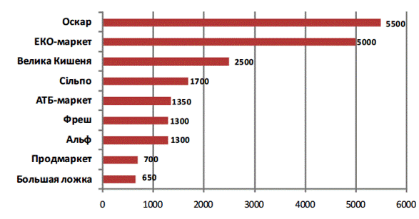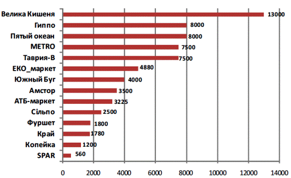 Диагр. 3. «Рейтинг продовольственных сетей Южной Украины по количеству торгових точек, шт»